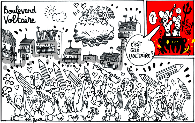 C’est qui Voltaire ? Préambule C’est le 12 janvier 2015 que Plantu a publié dans Le Monde le dessin* de la marche sur le boulevard Voltaire où les assassins de Charlie se retrouvent dans le chaudron du diable en train de se demander : « C’est qui Voltaire ? ».